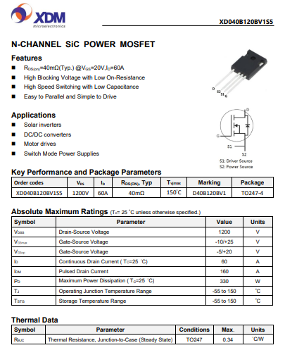 XD040B120BV1S5 40mohm 1200V TO-247 4L 電源(UPS/移動儲能/光伏逆變)