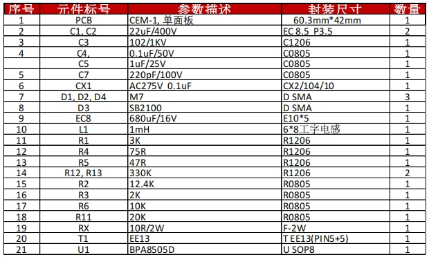 BOM是電源管理系統(tǒng)中所有元件的詳細(xì)列表,包括元件的型號、數(shù)量、制造商和規(guī)格等信息。對于BPA8505D的參考設(shè)計(jì),BOM確保了工程師能夠準(zhǔn)確地獲取所需的元件,從而復(fù)制或調(diào)整設(shè)計(jì)以滿足特定的應(yīng)用需求。