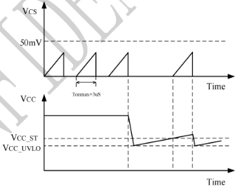 當VCC電壓超過設定的過壓閾值(通常為55V至59.5V)時,LP8776AH會觸發(fā)過壓保護機制。此時,芯片將停止輸出PWM信號,防止因過高的電壓對芯片內部電路和外部設備造成損害。過壓保護功能為芯片提供了一個安全的工作電壓范圍,確保其在電源電壓異常升高時能夠及時采取保護措施。