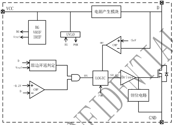 VCC供電:芯片內(nèi)部集成了VCC供電技術(shù),能夠在不需要輔助繞組供電的情況下,保證VCC電壓穩(wěn)定.當(dāng)系統(tǒng)上電后,通過內(nèi)置MOS的體二極管對輸出電容充電,當(dāng)VCC電壓達(dá)到開啟閾值時(shí),芯片內(nèi)部控制電路開始工作。