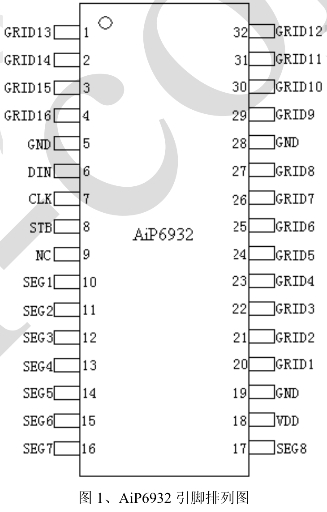 AiP6932是一款由無錫中微愛芯電子有限公司生產(chǎn)的3線串口共陰極8段16位LED驅(qū)動控制專用電路。這款芯片在LED顯示面板場合有著廣泛的應(yīng)用,如電磁爐、電飯煲、空調(diào)、機頂盒等家電產(chǎn)品的顯示。本文將詳細(xì)介紹AiP6932的引腳功能,為工程師和設(shè)計師提供全面的技術(shù)參考。