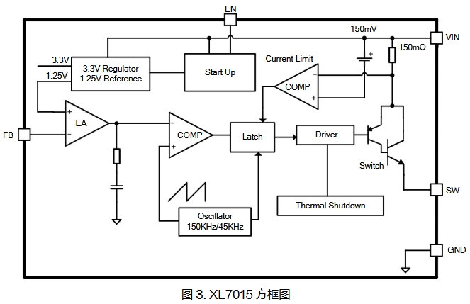 XL7015是一款高效、高壓降壓型DC-DC轉(zhuǎn)換器,固定150KHz開關(guān)頻率,可提供最高0.8A輸出電流能力,低紋波,出色的線性調(diào)整率與負載調(diào)整率。XL7015內(nèi)置固定頻率振蕩器與頻率補償電路,簡化了電路設(shè)計。PWM 控制環(huán)路可以調(diào)節(jié)占空比從0~90%之間線性變化。內(nèi)置輸出過電流保護功能,當輸出短路時,開關(guān)頻率從150KHz降至45KHz。內(nèi)部補償模塊可以減少外圍元器件數(shù)量。內(nèi)部框架圖如下~