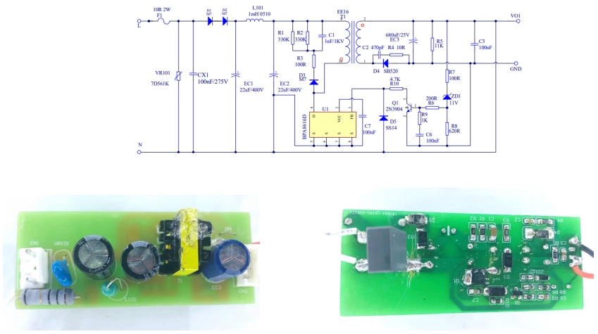 輸出整流濾波電路由肖特基二極管D4和電解電容EC3組成,將高頻脈沖電壓整流為穩定的直流輸出電壓。反饋控制電路由光耦、穩壓管ZD1和電阻R9等元件組成,用于檢測輸出電壓的變化,并將其反饋到BPA8616D芯片,以實現輸出電壓的穩定調節。