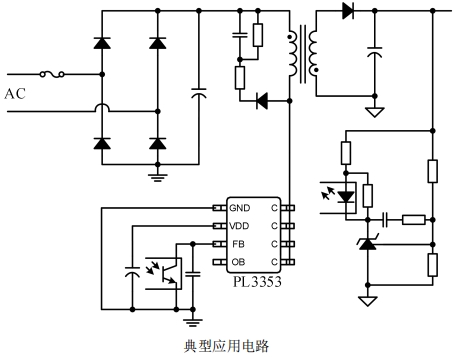 176Vac~264Vac電壓輸入、副邊反饋的隔離電源。PL3353內(nèi)部集成了700V功率開關(guān)、高壓啟動電路和電流采