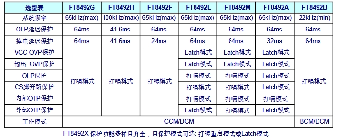 在保護(hù)功能方面,F(xiàn)T8492系列芯片提供了多種保護(hù)機(jī)制,且保護(hù)模式可選。例如,其過(guò)載保護(hù)(OLP)和輸出過(guò)壓保護(hù)(OVP)可選擇打嗝模式或Latch模式,以適應(yīng)不同的應(yīng)用場(chǎng)景和設(shè)計(jì)需求。打嗝模式在故障發(fā)生時(shí)會(huì)自動(dòng)重啟芯片,而Latch模式則會(huì)鎖定故障狀態(tài),直到故障排除后重新啟動(dòng)。這種靈活的保護(hù)模式選擇,為設(shè)計(jì)人員提供了更大的靈活性,能夠根據(jù)具體應(yīng)用需求優(yōu)化保護(hù)策略。