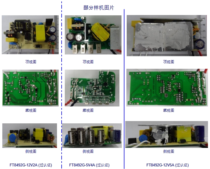 FT8492G作為該系列的典型型號(hào),已經(jīng)成功應(yīng)用于多種適配器設(shè)計(jì)中。例如,F(xiàn)T8492G-12V2A、FT8492G-5V4A和FT8492G-12V5A等樣機(jī)均已通過(guò)相關(guān)認(rèn)證。這些樣機(jī)的性能表現(xiàn)優(yōu)異,不僅在效率上達(dá)到了DoE/CoC六級(jí)標(biāo)準(zhǔn),還在實(shí)際使用中表現(xiàn)出良好的穩(wěn)定性和可靠性。