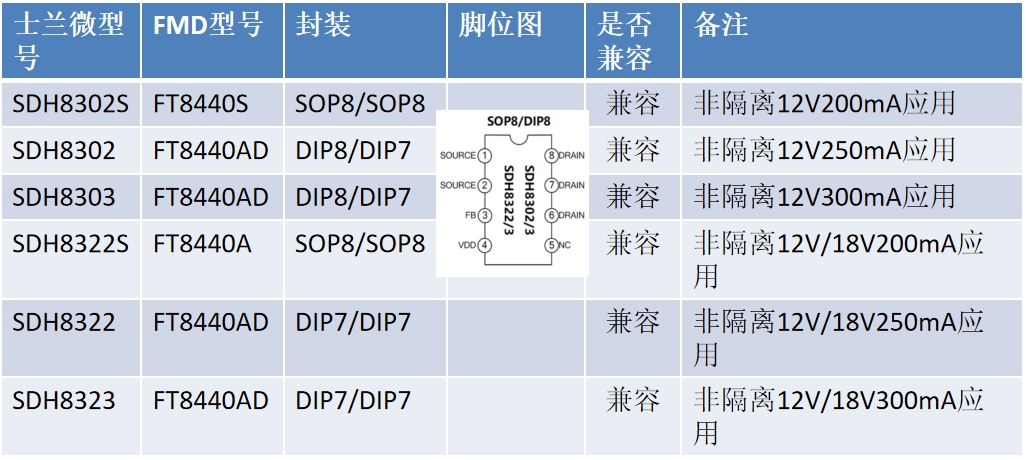 士蘭微的SDH8302S、SDH8302、SDH8303、SDH8322S、SDH8322和SDH8323型號與FT8440系列芯片在封裝和腳位上兼容。這些型號涵蓋了非隔離12V200mA、12V250mA、12V300mA以及12V/18V200mA、12V/18V250mA、12V/18V300mA等多種應用,F(xiàn)T8440系列芯片能夠全面替代這些型號,滿足不同用戶的需求。
