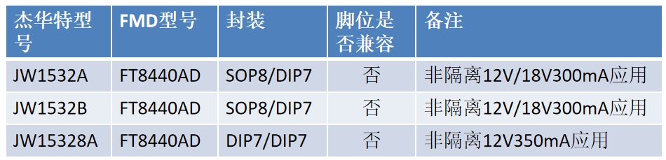 杰華特的JW1532A、JW1532B和JW15328A型號與FT8440AD在功能和性能上具有相似性。這些型號涵蓋了非隔離12V/18V300mA和12V350mA等多種應用,F(xiàn)T8440AD能夠替代這些型號,為用戶提供更加高效和可靠的電源解決方案。