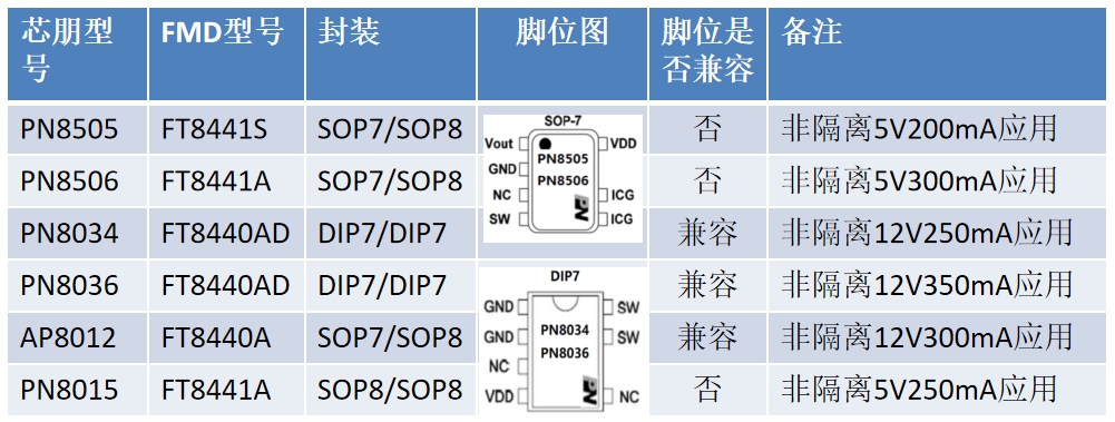 芯朋微的PN8034和PN8036型號與FT8440AD在封裝和腳位上完全兼容。PN8034是非隔離12V250mA應用,而PN8036是非隔離12V350mA應用,F(xiàn)T8440AD能夠無縫替代這兩款型號,無需對電路進行任何修改,即可實現(xiàn)相同的功能和性能。