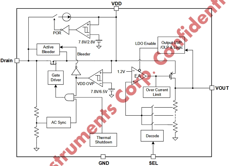 | 5,6,7,8 | Drain | 內(nèi)部功率MOSFET漏極引腳。在電壓處于充電窗口內(nèi)時提供能量。 |