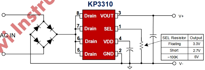 該芯片支持多種輸出電壓選項,包括5V、3.3V和2.7V,通過SEL引腳進行編程選擇。這種靈活性使得KP3310SGA能夠適應多種應用場景,滿足不同設(shè)備對電源電壓的需求。
