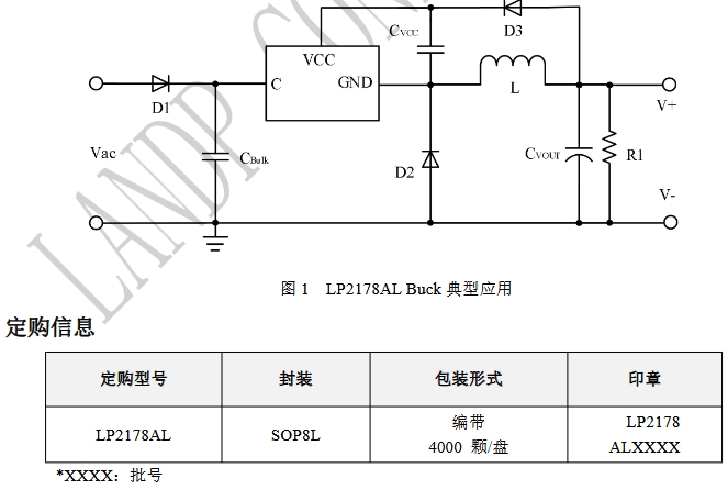 LP2178AL是一款高效率、高精度的非隔離降壓開關電源恒壓控制驅(qū)動芯片,其內(nèi)部集成高壓功率管,采用恒壓控制模式,系統(tǒng)可工作于CCM和DCM模式。采用特有的PFM控制方式,改善音頻特性。外圍應用簡單,可靠性強。典型應用圖如下所示