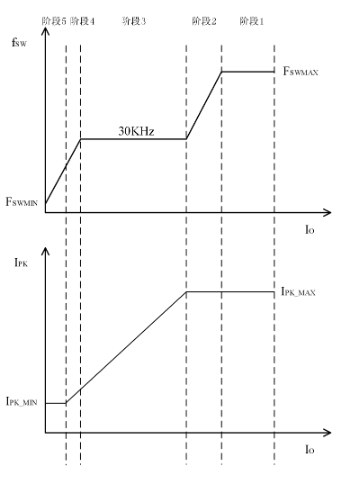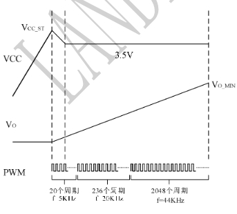 通過啟動電路給VCC電容充電,VCC達到啟動電壓VCC_ST,芯片輸出PWM開關信號。此時輸出電壓開始上升,因輸出電壓還小,VCC電壓會下降到3.5V,VCC通過自供電維持在3.5V。PWM開關信號經(jīng)過以下3個階段,軟啟動結束。軟啟動結束時,輸出電壓上升到VO_MIN:若VO_MIN>3.5V,芯片正常工作;若VO_MIN<3.5V,芯片輸出短路保護。