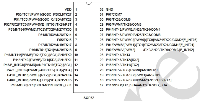AiP8F3532 提供了多種封裝形式,包括 SOP32、SOP28、LQFP32 和 QFN32 等,以滿足不同用戶的需求。以下是其中幾種封裝形式的引腳排列圖: