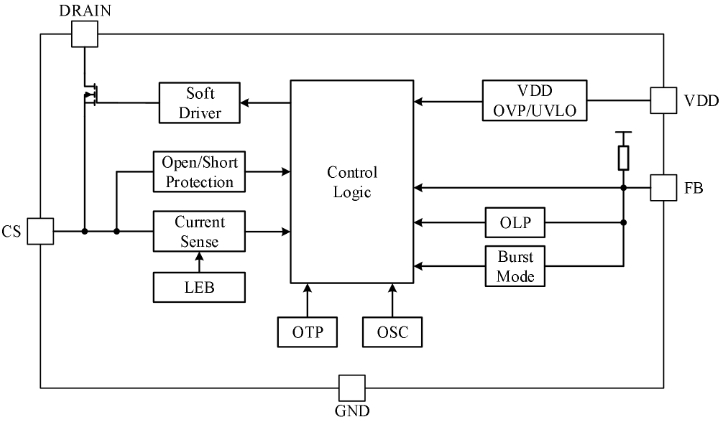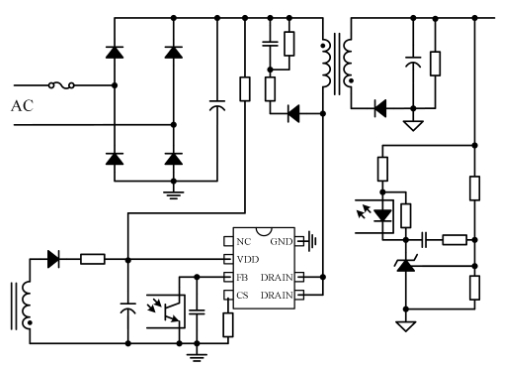 | FB | 反饋端輸入,接收次級反饋信號并調(diào)節(jié)CS端的峰值電壓以及芯片的輸出電壓 |