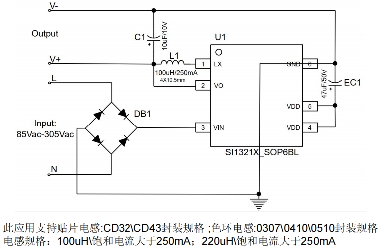 此應用電路支持貼片電感(CD32/CD43封裝規格)和色環電感(0307/0410/0510封裝規格)。電感規格為100uH,飽和電流大于250mA;220uH,飽和電流大于250mA。