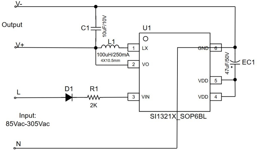 SI1321X系列無需繞線電阻、壓敏電阻,即可通過2KV浪涌測試;無需π形濾波、色環電感、安規電容,也能輕松通過EMI測試。這種設計極大地簡化了電路設計,減少了元件數量,降低了成本,同時也提高了系統的可靠性和穩定性。