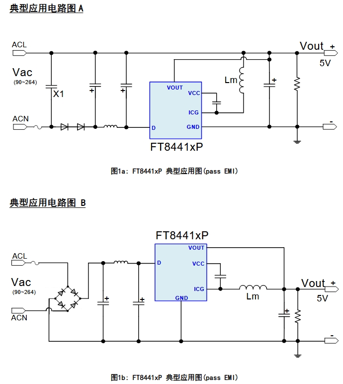 FT8441TP 的典型應用電路圖展示了其在實際應用中的簡潔性和高效性。圖 1a 和圖 1b 分別展示了兩種典型的應用場景,均能夠通過簡單的電路設計實現(xiàn)穩(wěn)定的 5V 輸出。在這些電路中,F(xiàn)T8441TP 的各個管腳連接明確,輸入端接入 90-264V 的交流電壓,經(jīng)過內(nèi)部的處理后,在輸出端得到所需的直流電壓。通過合理選擇外部元件,如功率電感等,可以進一步優(yōu)化電路的性能,確保其在不同負載條件下的穩(wěn)定運行。這種簡潔而高效的電路設計,使得 FT8441TP 能夠輕松應用于各種需要穩(wěn)定電源的小家電輔助電源、智能家居設備以及替代傳統(tǒng)線性電源和 RCC 電源的場合。