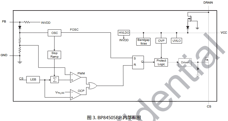 BP84505P的輸入端通常連接到交流電源,通過整流橋將其轉換為直流電壓,為后續的電路提供穩定的輸入。輸入電壓范圍通常為90V~264V,能夠適應不同地區的電網電壓波動,確保設備在全球范圍內都能正常工作。在輸入端還配備有過壓保護(OVP)和欠壓保護(UVLO)功能,當輸入電壓超過或低于設定閾值時,芯片將自動關閉輸出,保護電路免受損壞。