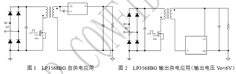 在自供電應(yīng)用中,LP3568BG通過(guò)其D腳連接輸出電壓,利用內(nèi)置MOS的體二極管對(duì)輸出電容充電,實(shí)現(xiàn)自供電啟動(dòng)。當(dāng)VCC電壓達(dá)到開(kāi)啟閾值時(shí),芯片內(nèi)部控制電路開(kāi)始工作,MOS管正常導(dǎo)通和關(guān)斷,電流從MOS管的溝道流過(guò),而非體二極管,從而實(shí)現(xiàn)高效的同步整流。這種應(yīng)用方式適用于需要簡(jiǎn)化電路設(shè)計(jì)、減少外部電源依賴(lài)的場(chǎng)景。