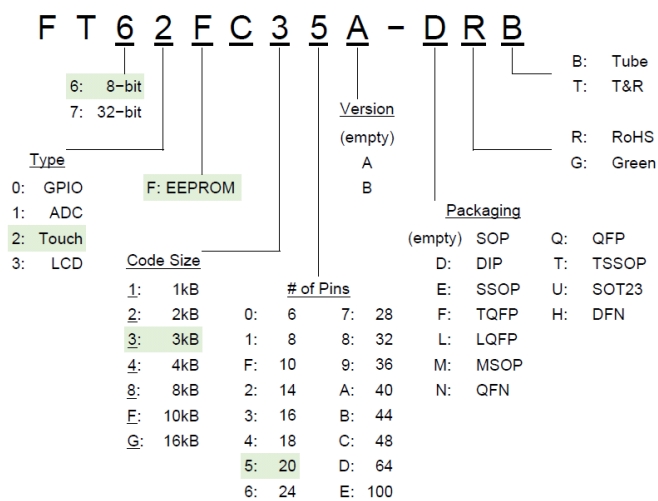 FT62FC6X系列的基礎(chǔ)型號(hào)為“FT62FC”,其中: