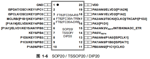 FT62FC6X系列微控制器根據(jù)不同的封裝類型和功能需求,提供了多種引腳配置。以下是結(jié)構(gòu)框圖及一些常見(jiàn)的引腳及其功能介紹: