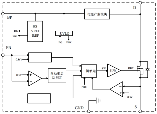 集成500V高壓功率管,無需外部啟動(dòng)電阻和輔助繞組供電,簡化外圍電路;