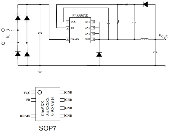 BPA8504D 芯片:SOP-7 封裝,集成 650V MOSFET 和 PWM 控制器。