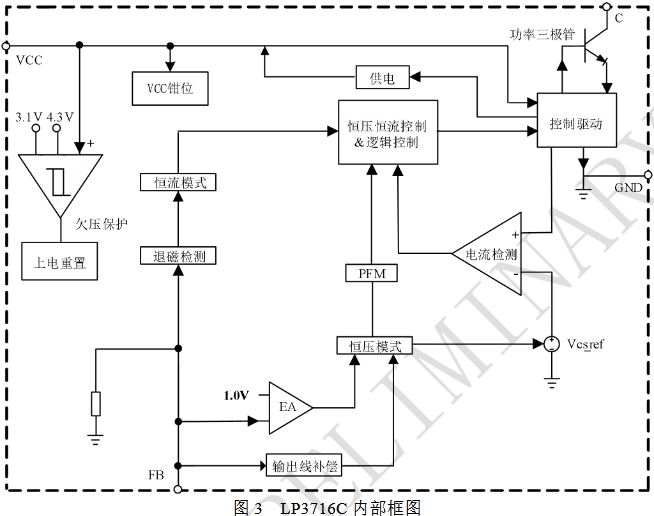 LP3716C:底部裸露焊盤需通過PCB散熱,實測在12W滿載時芯片溫度達105℃(環境溫度25℃)。LP3716C內部框架圖如下所示~