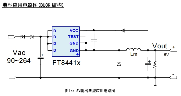 FT8441S 和 FT8441A 在 Buck 結(jié)構(gòu)下的 5V 輸出應(yīng)用電路非常簡(jiǎn)潔高效,以下是其典型應(yīng)用電路圖及設(shè)計(jì)要點(diǎn):
