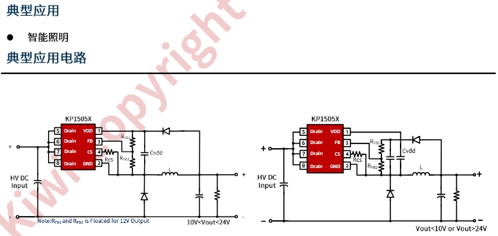 KP15052SPA | 5 Ω | 12 V (FB懸空) | 350 mA | 6-8 W | 吸頂燈 / 筒燈輔光 |