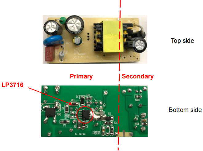 官方照片:正面LP3716+變壓器,背面僅5顆貼片電阻電容,一張銀行卡大小。