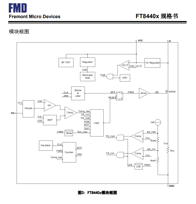 FT8440x采用超高壓工藝,內部集成高壓啟動電路,高壓功率開關,以及電流采樣電阻,減少了外部元器件,極大地簡化了系統應用。內置的頻率抖動和軟驅動設計能有效提高EMI性能。