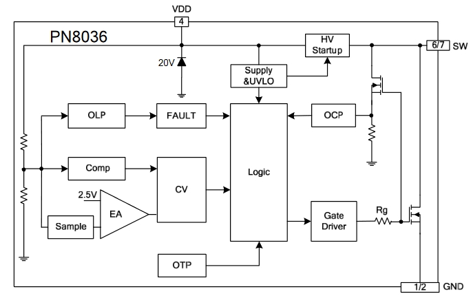 PN8036寬輸出范圍非隔離交直流轉(zhuǎn)換芯片 ,集成PFM控制器及650V高雪崩能力智能功率MOSFET,用于外圍元器件極精簡(jiǎn)的小功率非隔離開關(guān)電源。PN8036內(nèi)置650V高壓?jiǎn)?dòng)模塊,實(shí)現(xiàn)系統(tǒng)快速啟動(dòng)、超低待機(jī)功能。該芯片提供了完整的智能化保護(hù)功能,包括過流保護(hù),欠壓保護(hù),過溫保護(hù),另外PN8036的降頻調(diào)制技術(shù)有助于改善EMI特性。、