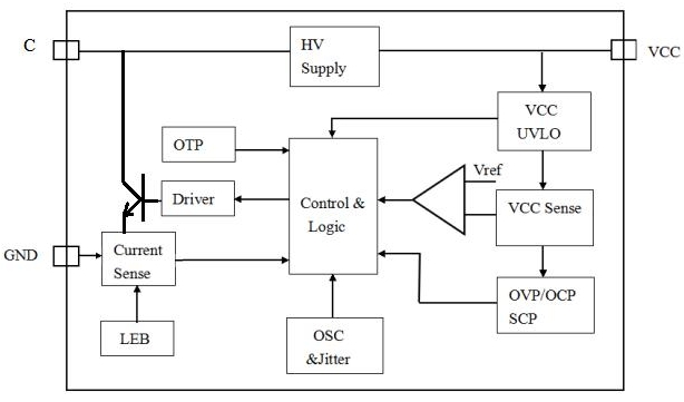其內(nèi)部集成了650V功率開關(guān),采用專利電壓電流控制技術(shù),無需外部電壓反饋和電流偵測電路即可實(shí)現(xiàn)精確的電壓和電流調(diào)節(jié),并可實(shí)現(xiàn)兩種輸出電壓選擇,極大的方便客戶使用。