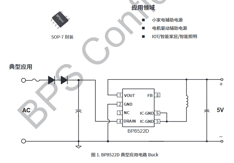 BP8522D芯片適用于多種小家電輔助電源,如電飯煲、風扇、破壁機等,同時也適用于電機驅動輔助電源和IOT/智能家居/智能照明領域。