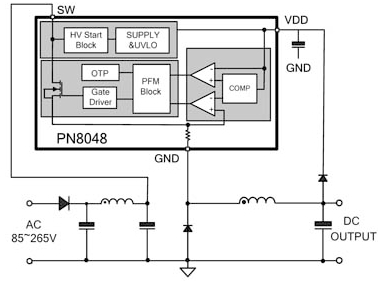 PN8048是一款專為移動設(shè)備設(shè)計的電源管理IC,它采用了先進的電源轉(zhuǎn)換技術(shù),以實現(xiàn)高效率和低功耗。PN8048通常用于需要快速充電和高效率電源轉(zhuǎn)換的場合,如智能手機、平板電腦等。PN8048典型應(yīng)用圖如下所示: