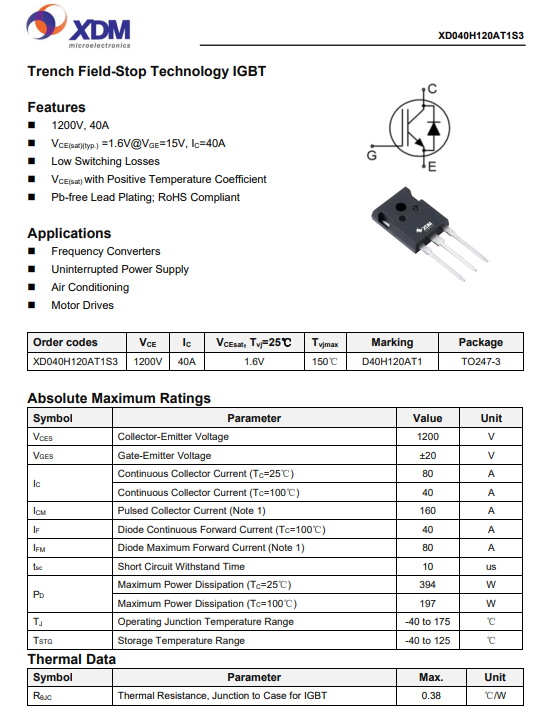 芯達(dá)茂XD040H120AT1S3國產(chǎn)IBGT +FRD單管 40A 1200V TO-247-3L