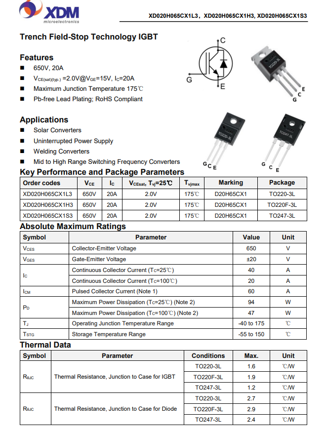 XD020H065CX1H3芯達茂國產IBGT +FRD單管 20A 650V TO-220F