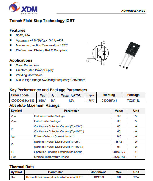 XD040Q065AY1S3芯達茂 國產IBGT +FRD單管 40A 650V TO-247-3L